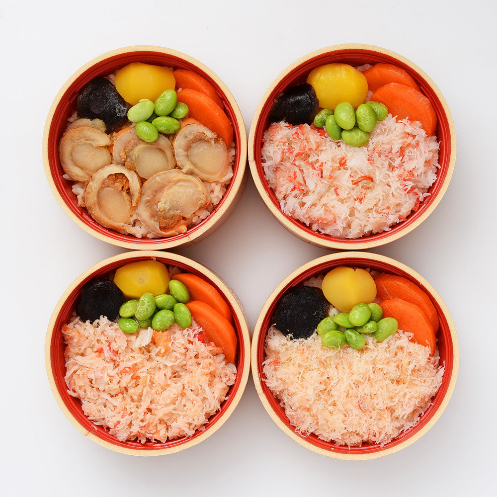毛蟹わっぱ飯、たらば蟹わっぱ飯、ずわい蟹わっぱ飯、帆立わっぱ飯 各180g