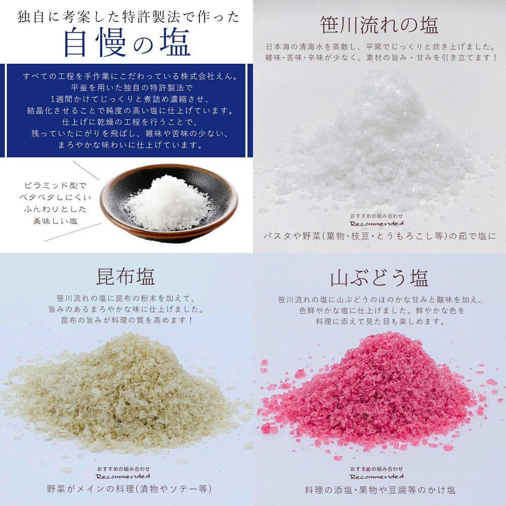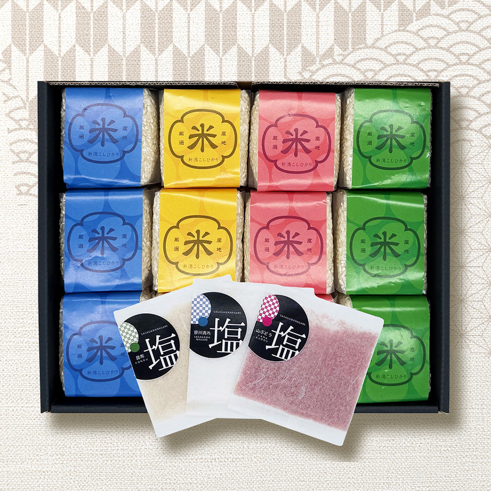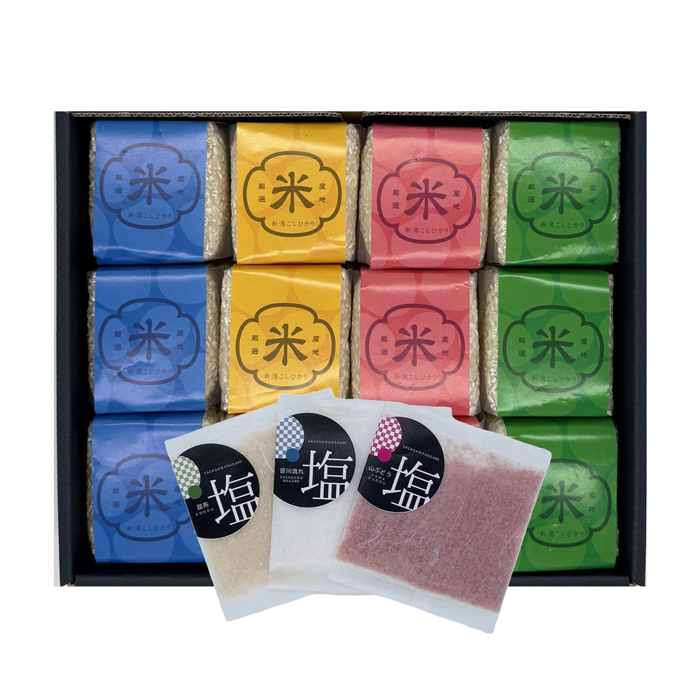 セット内容:新潟県産コシヒカリ1合(約150g)x12/笹川流れの塩20gx1/山ぶどう塩20gx1/昆布塩20gx1