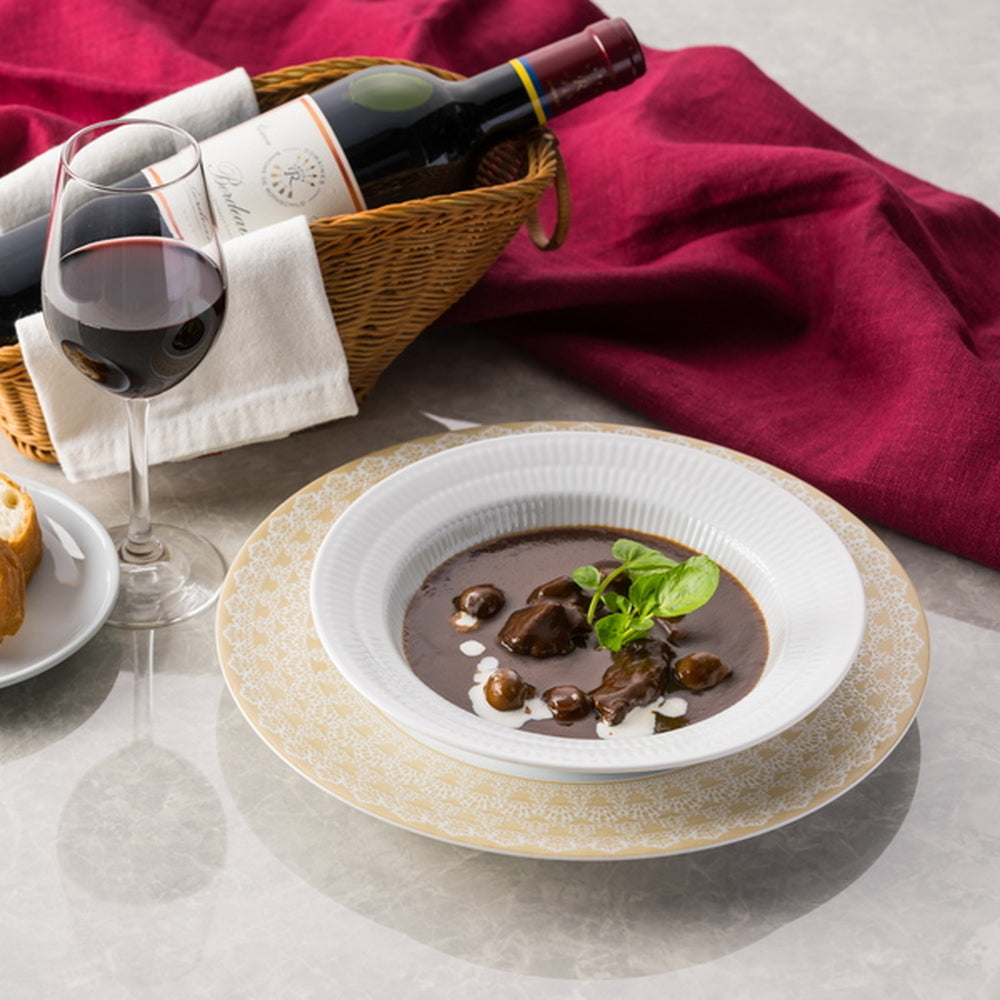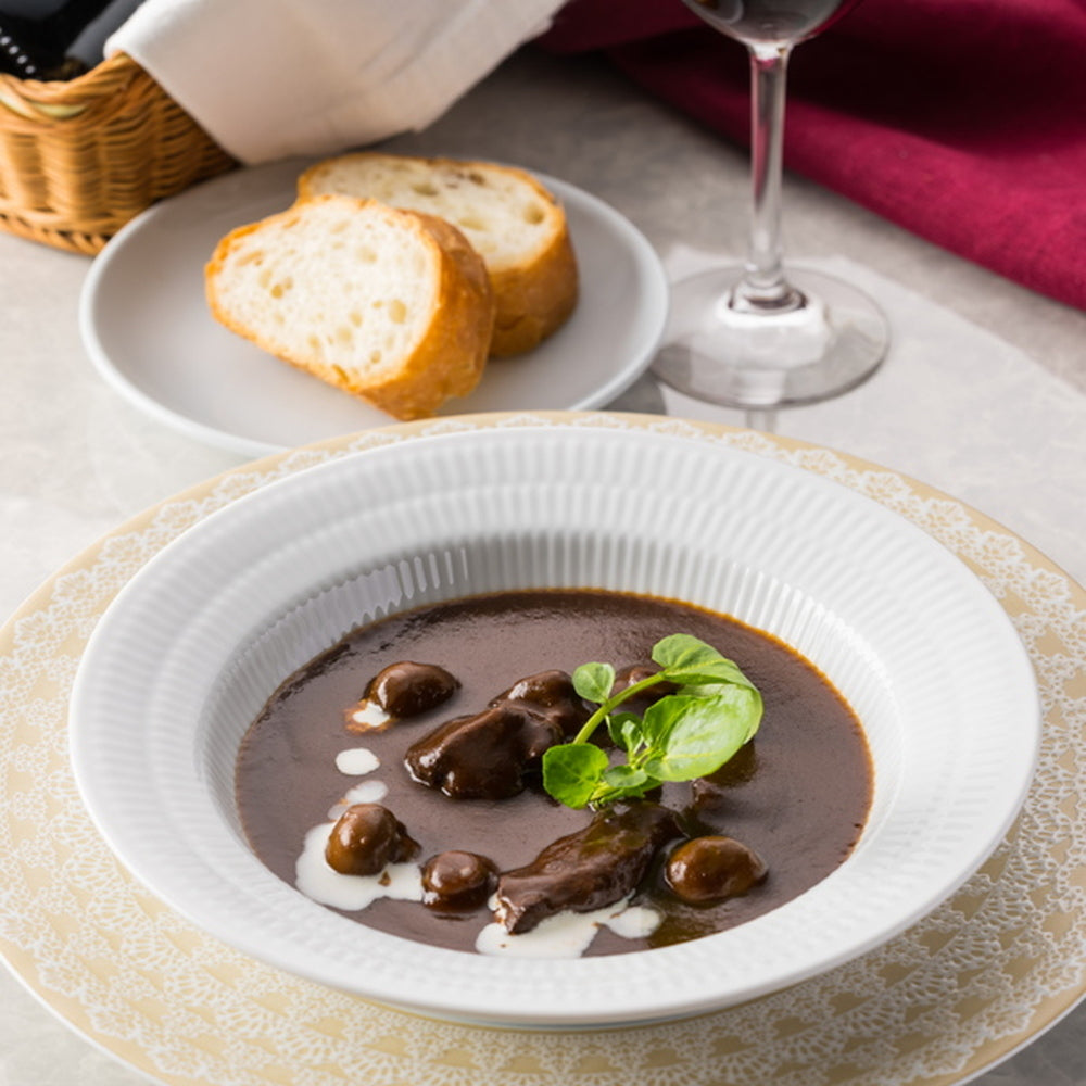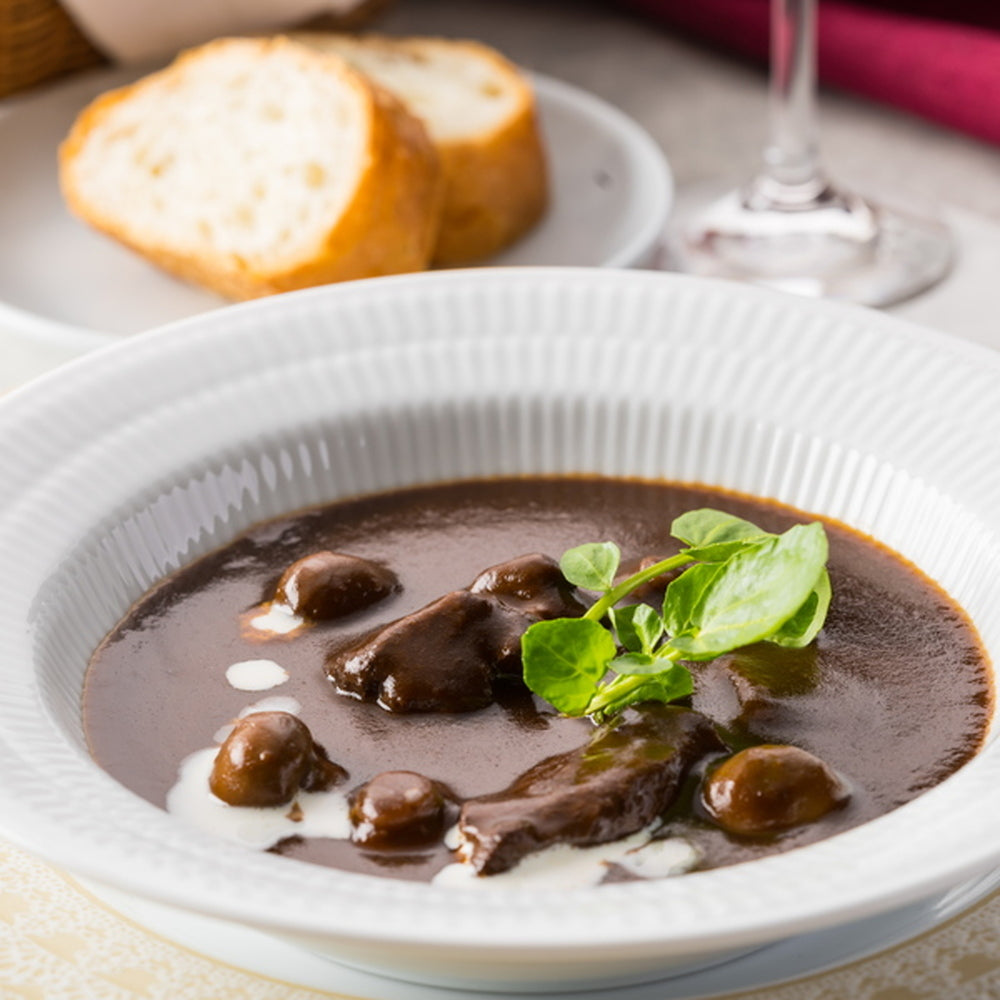 ■六本木リューズ飯塚シェフが監修する濃厚な味わいのビーフシチュー。赤ワインを効かせたデミグラスソースでじっくり煮込み、風味豊かに仕上げました。ぷりぷりのマッシュルームと国産の牛肉の旨みが詰まった、本格フレンチのビーフシチューをお届けします。