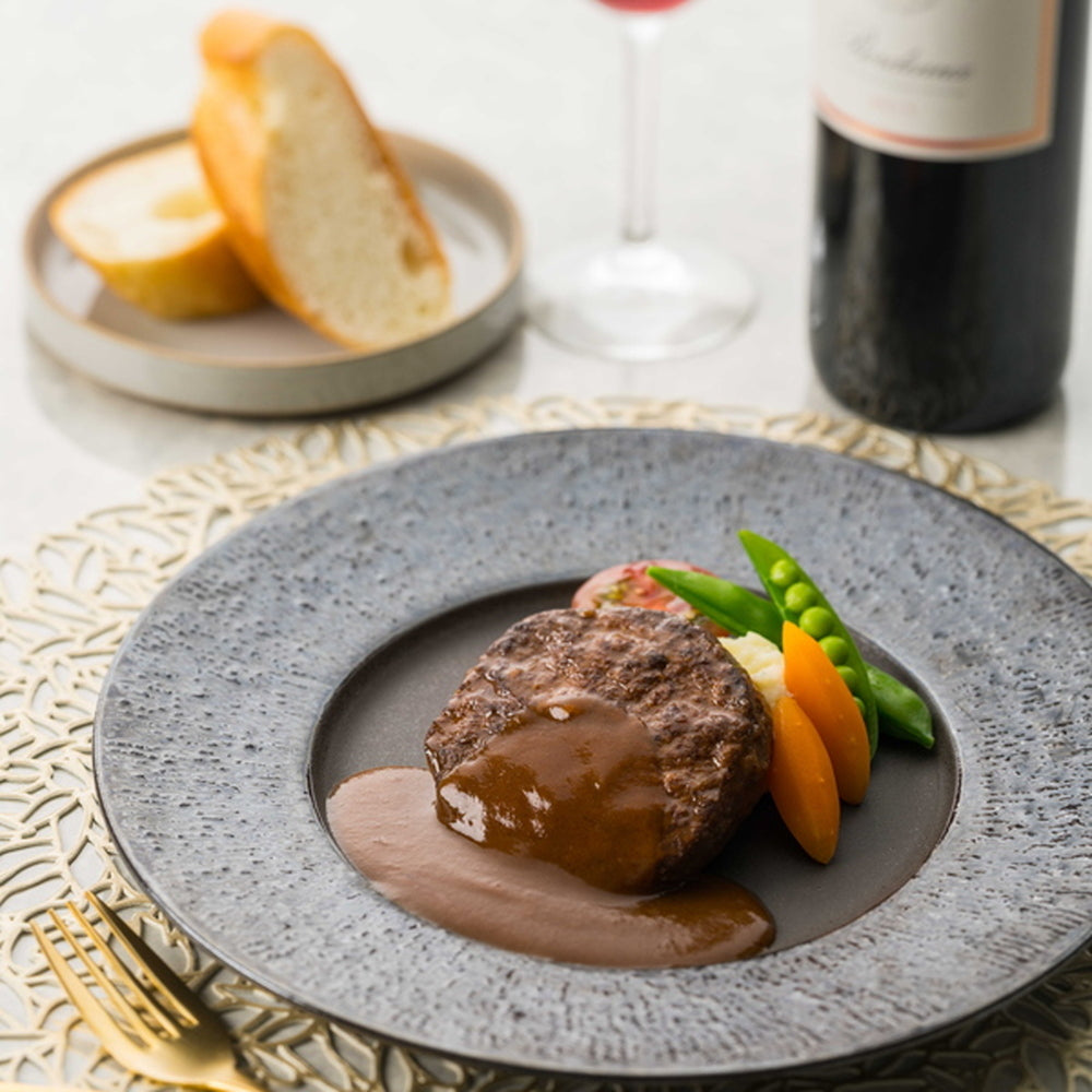 赤ワインとトマト、バターで奥深い味わいに仕上げたデミグラスソースに、温めたときにジューシーさが残るよう軽く焦げ目をつけて焼いたハンバーグを閉じ込めました。レンジアップでお召し上がりいただけます。