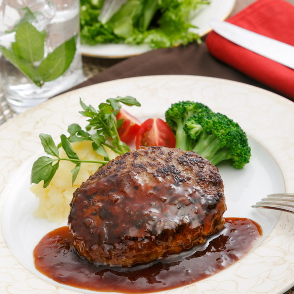 ■予約の取りにくい店で有名なラ・ベットラ・ダ・オチアイ。イタリアンの巨匠落合シェフが監修した肉汁たっぷりの牛肉100%のハンバーグ。ワインと黒トリュフを入れた風味豊かなソースをかければ、こだわりハンバーグの完成です。