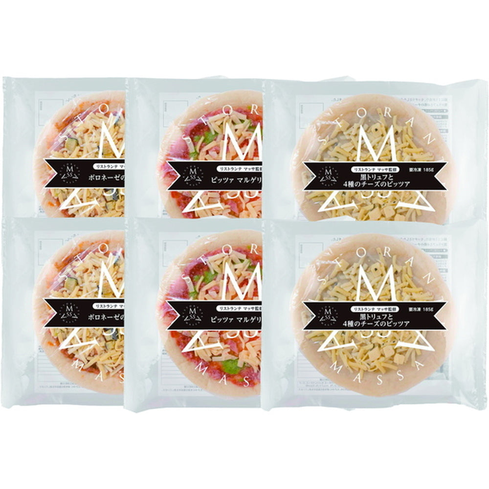■商品内容:リストランテマッサ監修 3種のこだわりナポリ風ピッツァ 黒トリュフと4種のチーズのピッツァ185g、ボロネーゼのピッツァ204g、ピッツァマルゲリータ 205g 各8インチ×2枚
