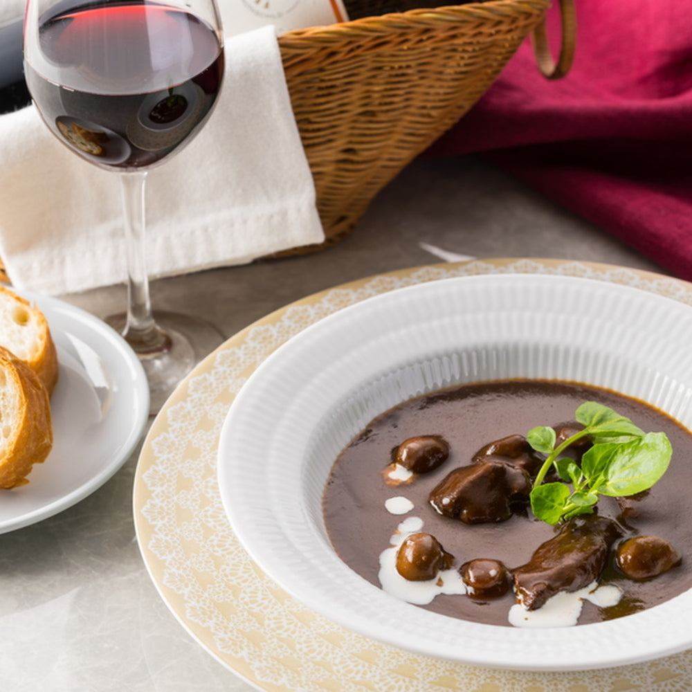 ■六本木リューズ飯塚シェフが監修する濃厚な味わいのビーフシチュー。赤ワインを効かせたデミグラスソースでじっくり煮込み、風味豊かに仕上げました。ぷりぷりのマッシュルームと国産の牛肉の旨みが詰まった、本格フレンチのビーフシチューをお届けします。