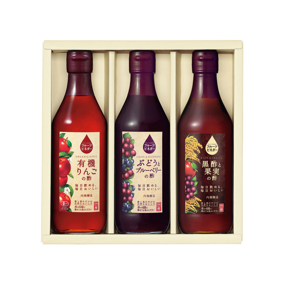 ■フルーツビネガー「有機りんごの酢」、「ぶどうとブルーベリーの酢」、「黒酢と果実の酢」の詰め合わせセットです。