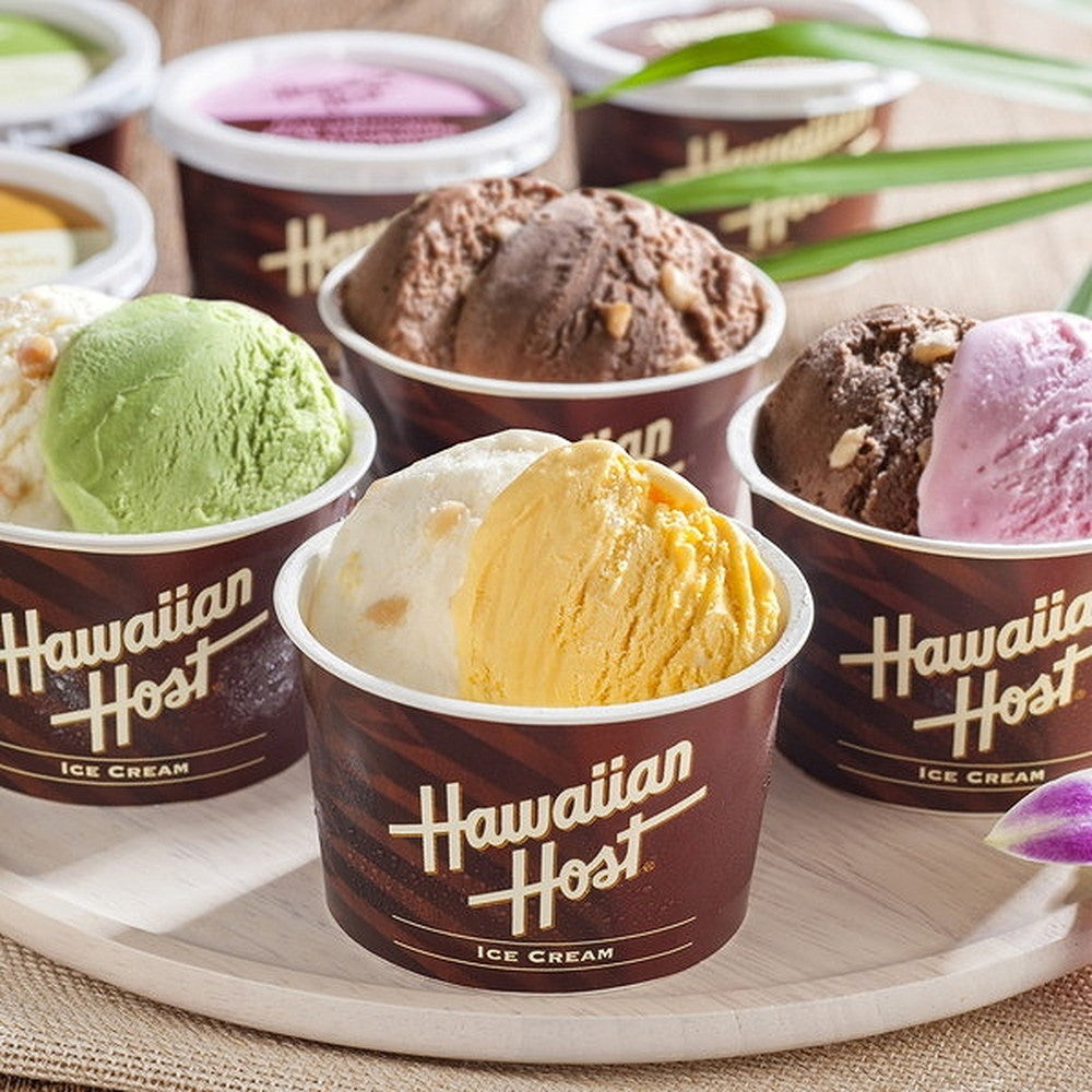 ■「ハワイアンホースト」の代名詞であるマカダミアナッツのクラッシュを練りこんだミルクチョコアイスと、ミルクとホワイト2種のマカダミアチョコアイスに、相性抜群の3つのフレーバーを組み合わせ、見た目も味も楽しいアイスに仕上げました。