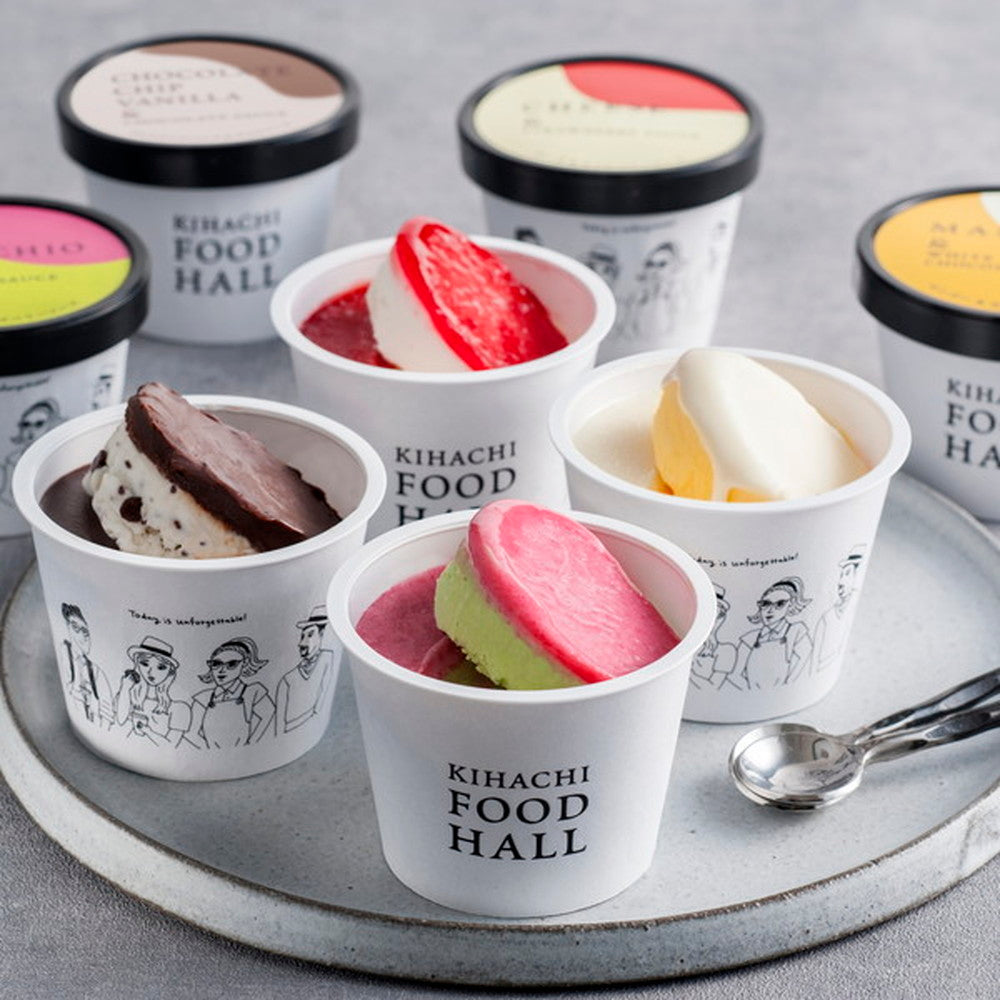 ■北海道の生クリームを使ったアイスとチョコやフルーツソースの相性を楽しめる2層仕立てのアイスクリーム。素材そのもののおいしさを引き出すKIHACHIならではのアイスギフトです。