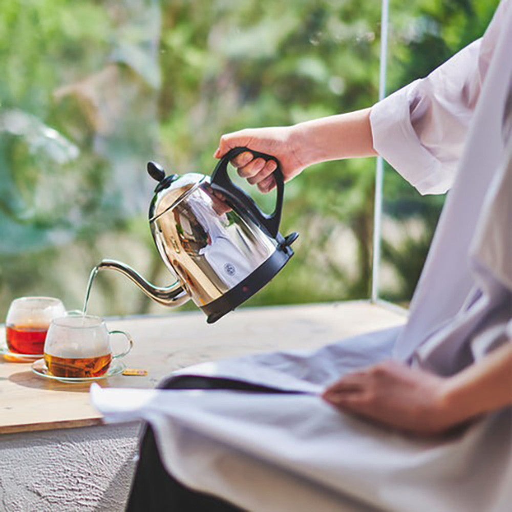 一般的な電気ジャーポットは、残り湯を捨てづらく、水を足して沸かすことが多いようです。しかし、ラッセルホブスのカフェケトルなら、やかんと同じ感覚で使用でき、注ぎ口が下のほうについているから、残り湯をより捨てやすくなり、いつでも新鮮なお湯を沸かせます。しかも、間口が広く手がラクに入るからお手入れも簡単です。