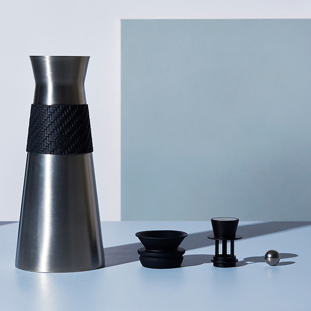 ボール入りのバルブキャップは、360度全方向からフレキシブルに注ぐことができます。ハンドルがない“フラスコ”のようなスリムなボトルデザインは、インテリアにも合わせやすく、サイドテーブルや卓上にもマッチします。