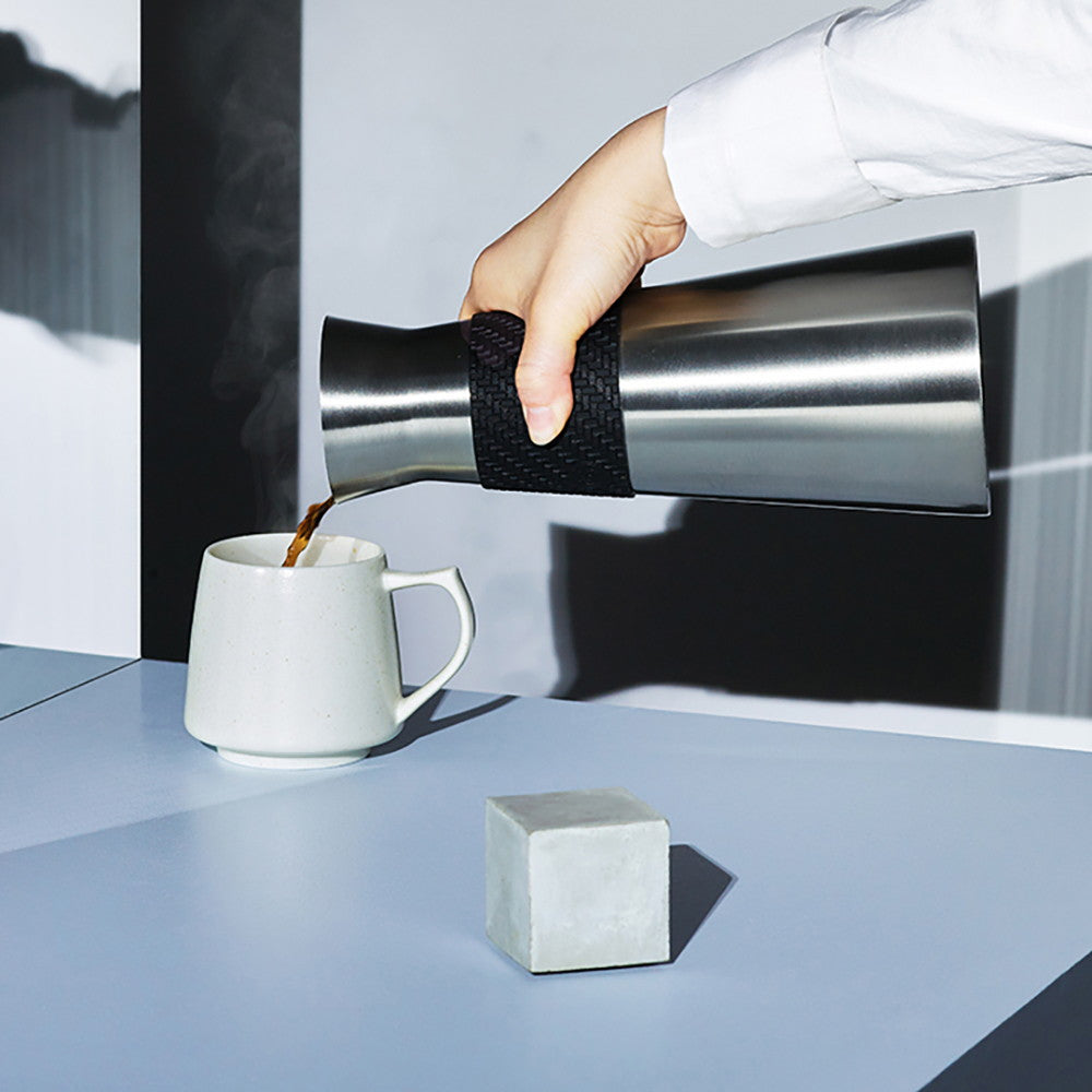 個性的なフォルムは、インテリアとしても暮らしに豊かさを与えます。つかみやすいシリコングリップと、傾けると自動開閉するボールバルブにより注ぐ方向を選びません。また注ぎ口は、適温を保った飲み物を何度でも愉しめるようデザインされています。保温可能な卓上ポットとしてもお洒落で優れたアイテムです。