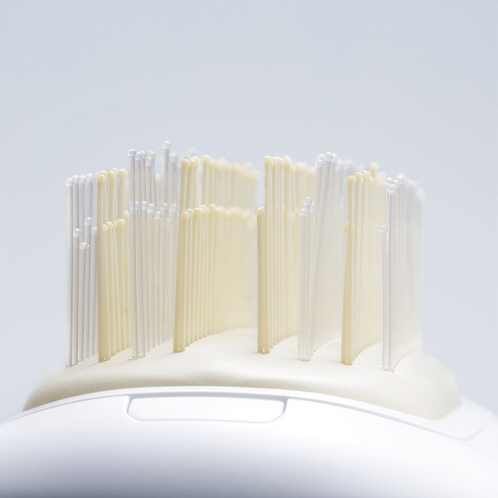 ソフトクッションとメタルの球先が頭皮をやさしく刺激。髪通りが良いピンは髪質を選ばず、付着した汚れもオフ。まとめ髪や逆毛、ボリュームダウンなどもスタイリングに地肌に圧をかけやすい「ハードクッション」。長短2段のナイロンピンが髪と頭皮、毛穴にもフィット。ほど良いテンションでボリュームダウンもアップも可能。短いピンが髪の広がりを抑えて、長いピンが毛穴汚れをかき出す。