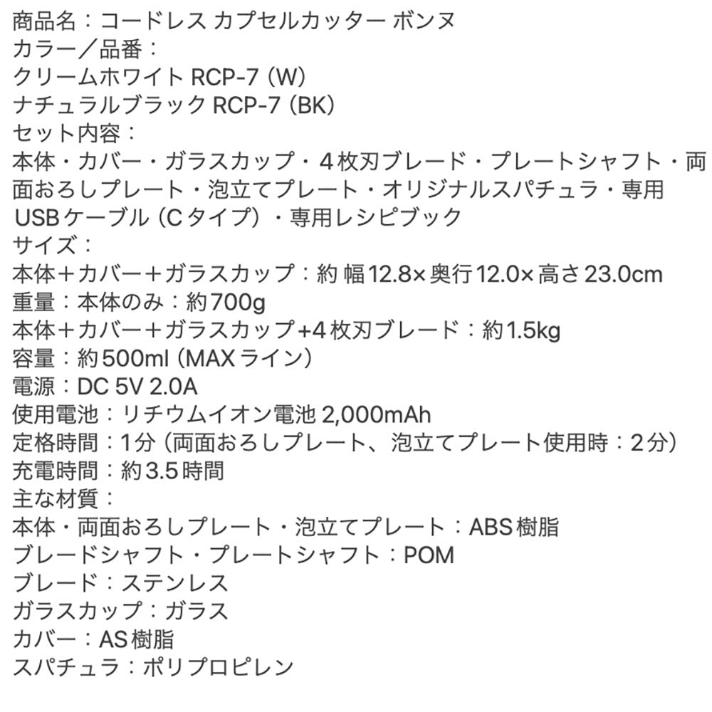 ■商品内容:レコルト コードレス カプセルカッターボンヌ クリームホワイト