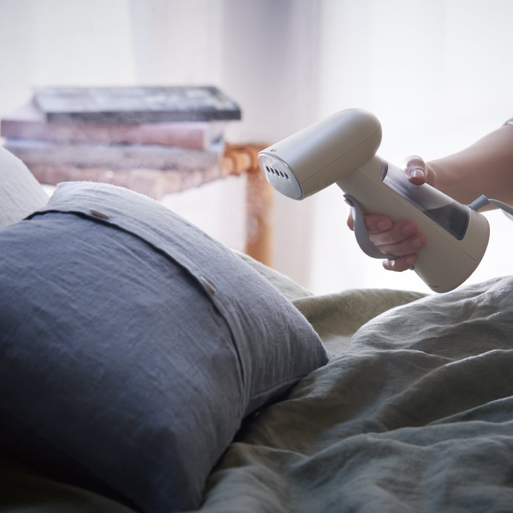 高温スチームの力で、衣類のシワやヨレをのばしてキレイに。電源を入れてから約25秒というスピーディーな立ち上がりだから、お出かけ前や帰宅後の忙しい時間にも、ハンガーにかけたまま手軽にお手入れ。気になった時にすぐに手に取れるよう、細かな使い勝手にまでこだわりました。全体のお手入れはスチームアイロンで、袖や襟などの細かい部分はプレスアイロンで仕上げることもできます。